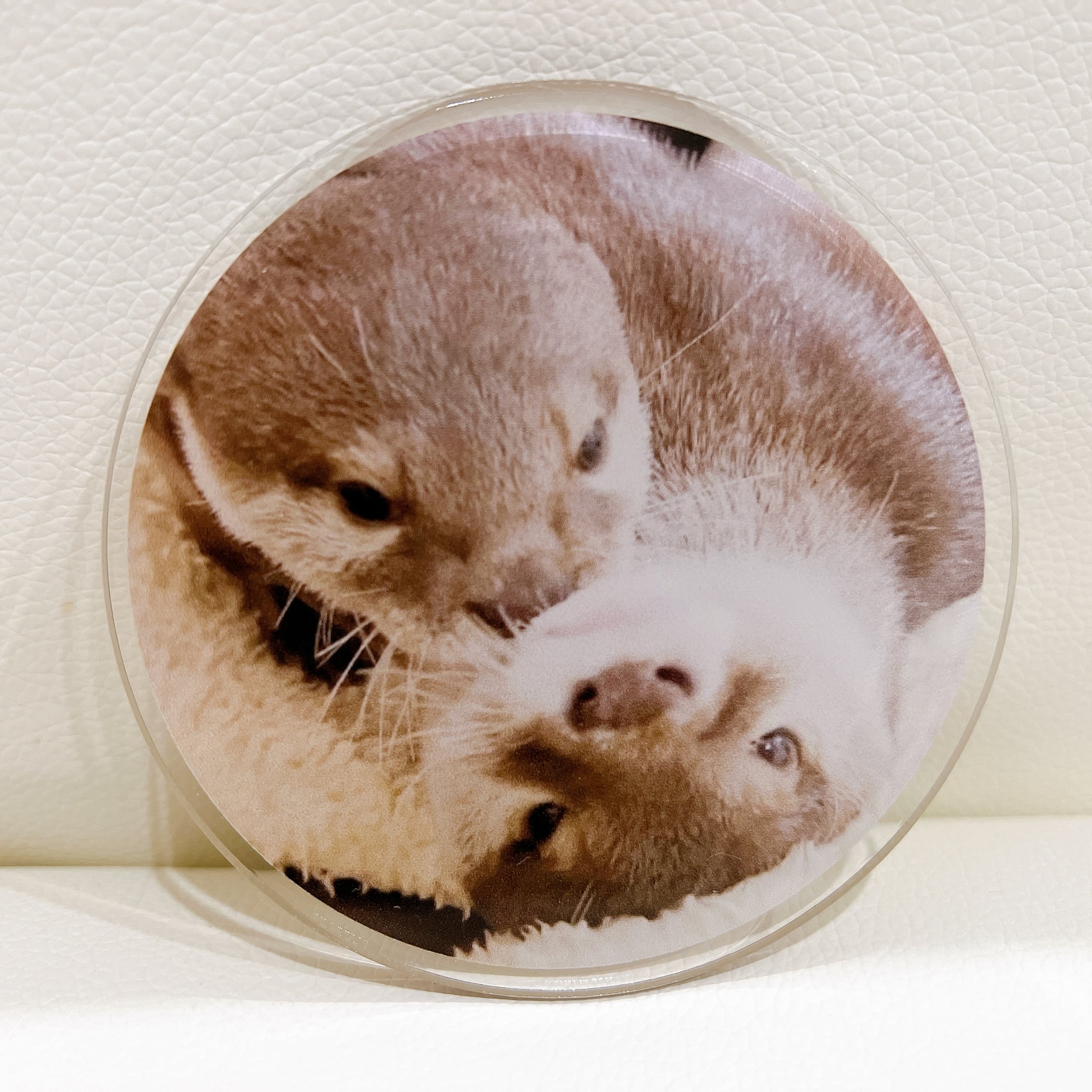 カワウソおだしととろろがぎゅ〜っと抱きついている、アクリルコースター。